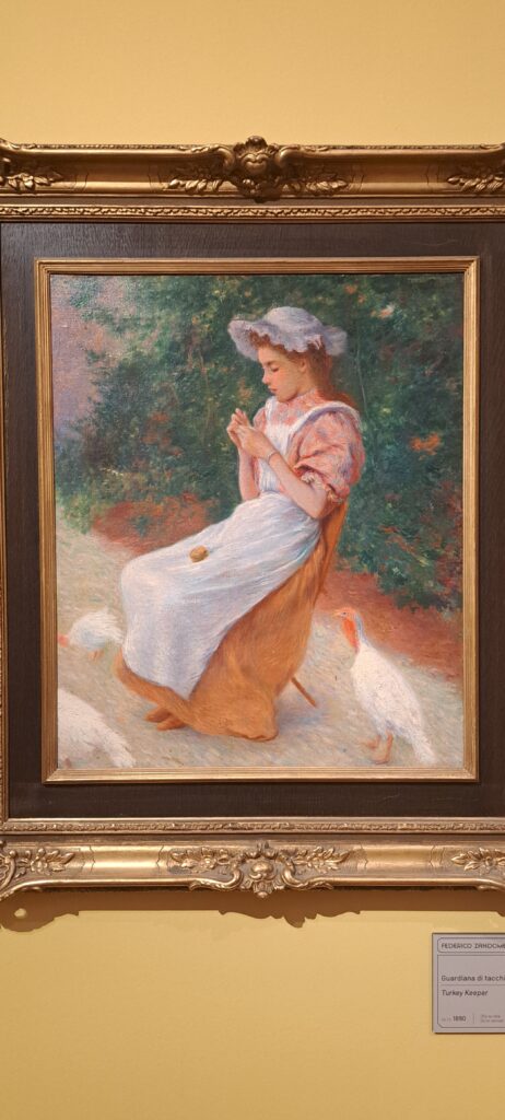 È la modernità che avanza, filtrata dallo sguardo di un artista radicato nel profondo Sud pugliese ma autentico cittadino del mondo. Con Guardiana di tacchini (1890) Federico Zandomeneghi sposta invece l’asse narrativo verso una dimensione più intima e raccolta.