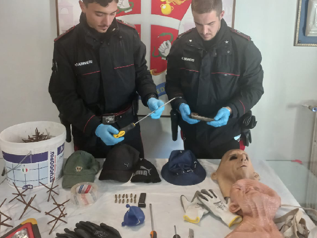 I militari dell’Arma hanno rinvenuto e sequestrato sulla loro autovettura, rubata in Puglia e avente targhe clonate “prese in prestito” da un’autovettura di una ignara donna residente in Abruzzo, una pistola con 12 proiettili, maschere da teatro, cappellini da “baseball”, guanti e un secchio con chiodi a tre punte, spesso utilizzati per impedire l’inseguimento da parte delle forze dell’ordine.