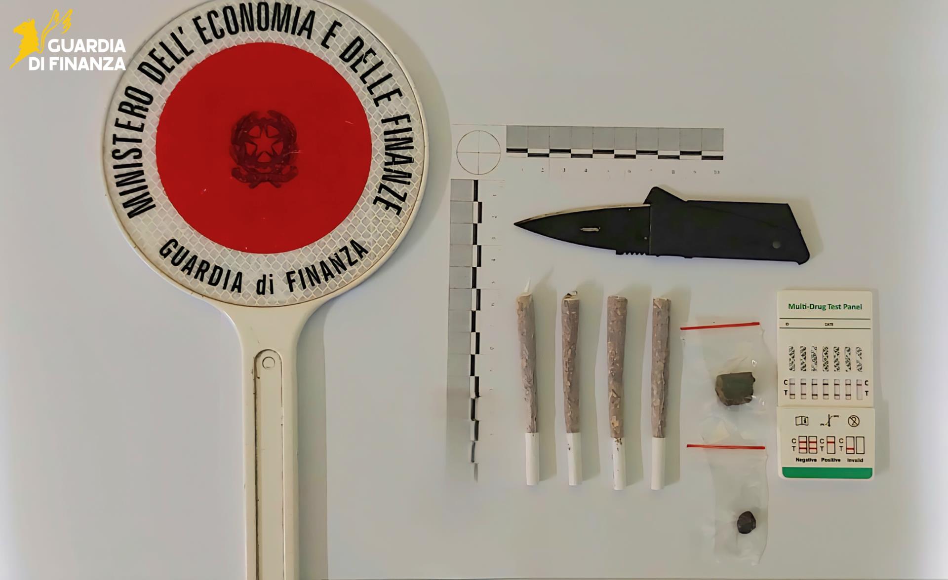 La GdF interviene nel parco, sequestra hashish e un coltello tattico, identifica il pusher e segnala due consumatori per uso personale.