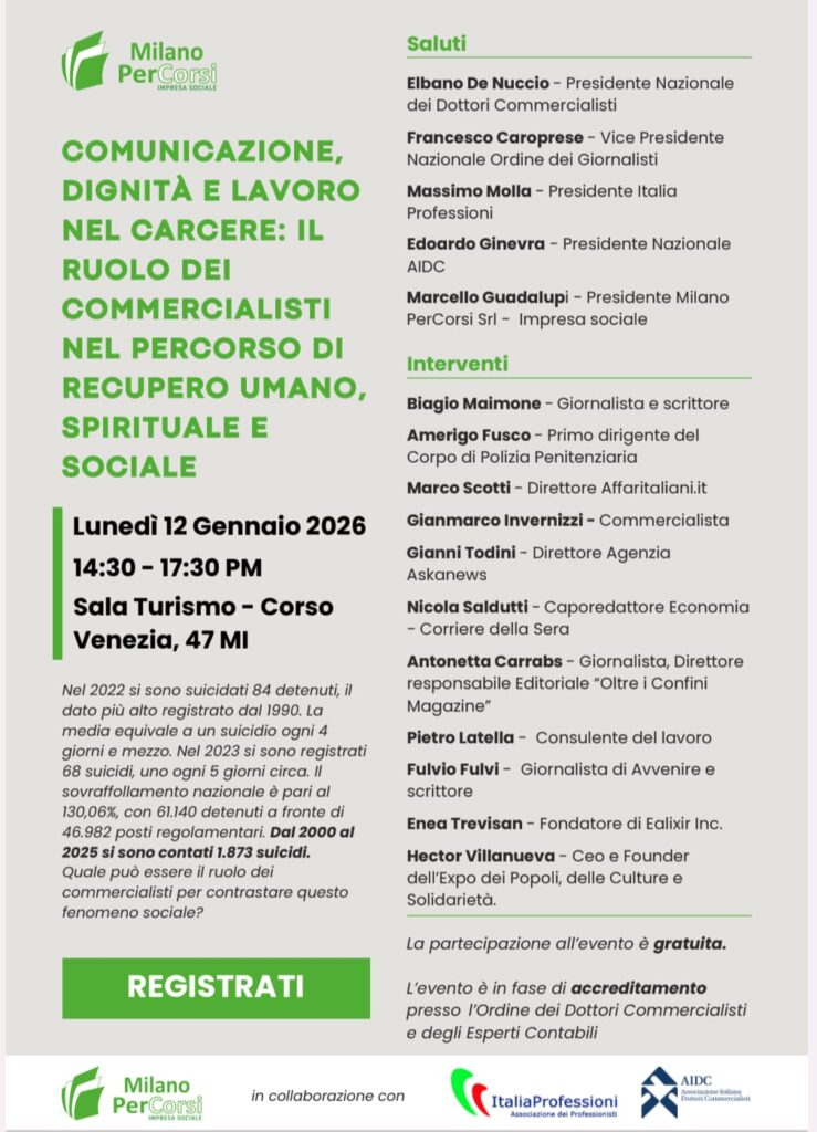 Milano – Il carcere come luogo di recupero umano e non di annientamento, il lavoro come strumento di dignità e prevenzione della recidiva, la comunicazione come leva decisiva contro isolamento, disagio e suicidi. Su questi temi si concentrerà la conferenza nazionale “Comunicazione, dignità e lavoro nel carcere: il ruolo dei commercialisti nel percorso di recupero umano, spirituale e sociale“, in programma lunedì 12 gennaio 2026 dalle ore 14.30 alle 17.30 presso la Sala Turismo della Sede di Confcommercio in Corso Venezia 47 a Milano.