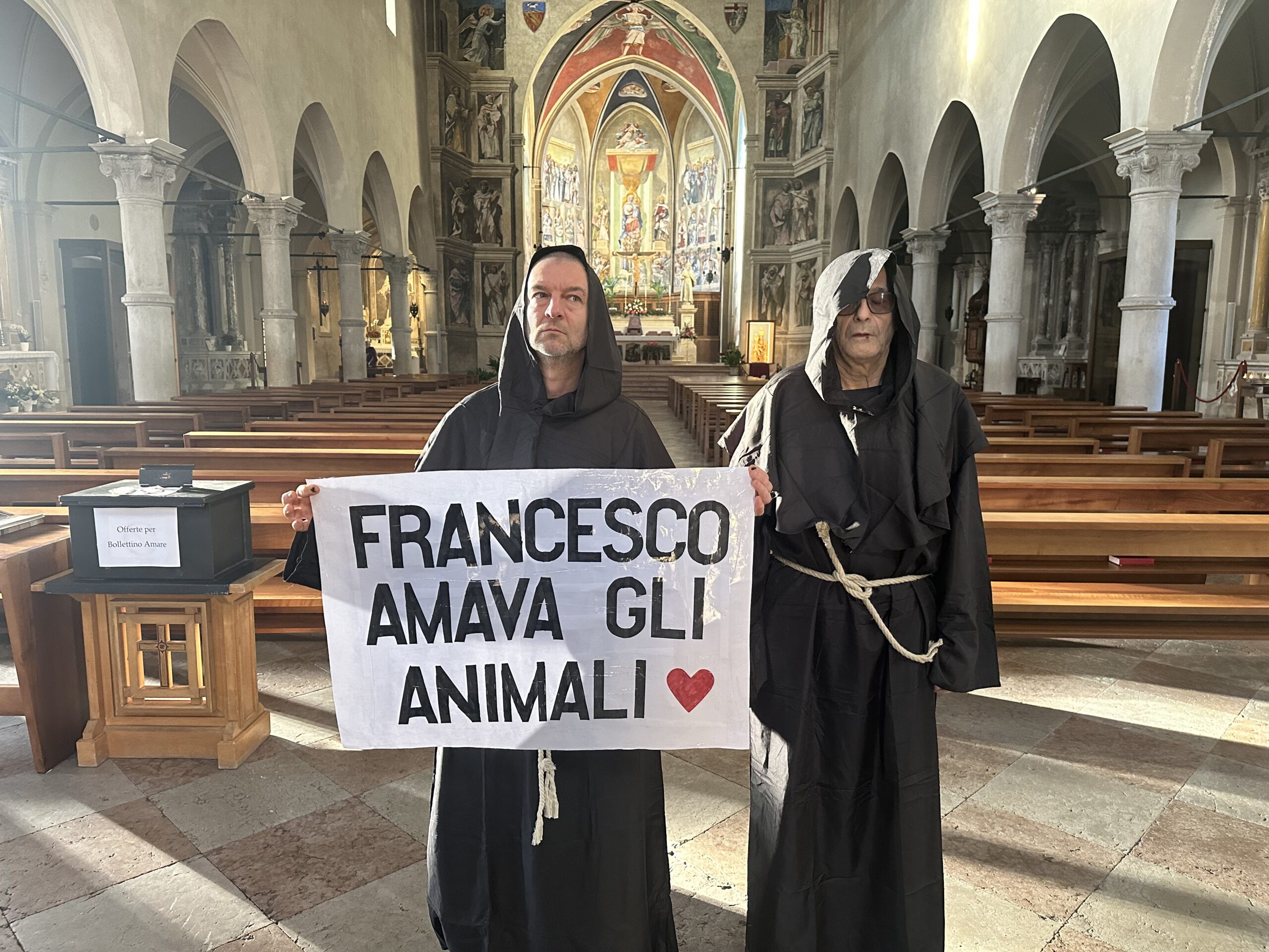 Per protestare contro il cartello di divieto affisso sulla porta del Duomo, i militanti hanno effettuato un blitz simbolico travestendosi da frati francescani ed esponendo un cartello con la scritta: “Francesco amava gli animali”. Sul posto sono intervenuti agenti della Digos che hanno identificato gli attivisti, i quali hanno consegnato spontaneamente il cartello.