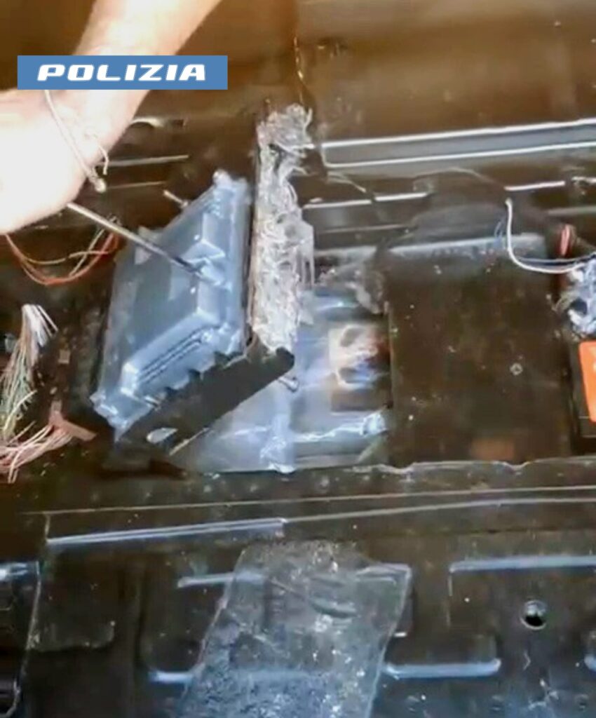 A seguito del controllo, i poliziotti hanno scoperto un sofisticato doppiofondo artigianale nel bagagliaio dell’auto, nascosto da una modifica tecnica con un meccanismo di apertura innestato su una centralina elettrica fittizia collegata all’impianto dell’auto, utilizzata per occultare la sostanza stupefacente.