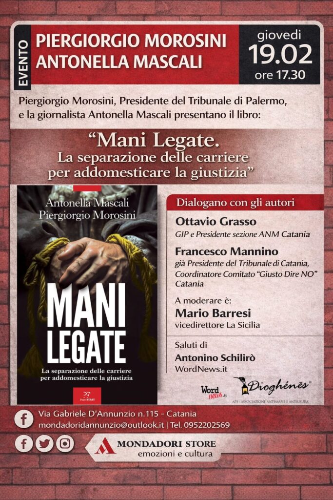 Catania – Giovedì 19 febbraio, alle ore 17.30, a Mondadori Store (Via Gabriele D’Annunzio 115), appuntamento pubblico con la presentazione del volume “Mani legate. La separazione delle carriere per addomesticare la giustizia” PaperFIRST editore. A presentare il libro saranno gli autori Piergiorgio Morosini, presidente del Tribunale di Palermo, e la giornalista Antonella Mascali.