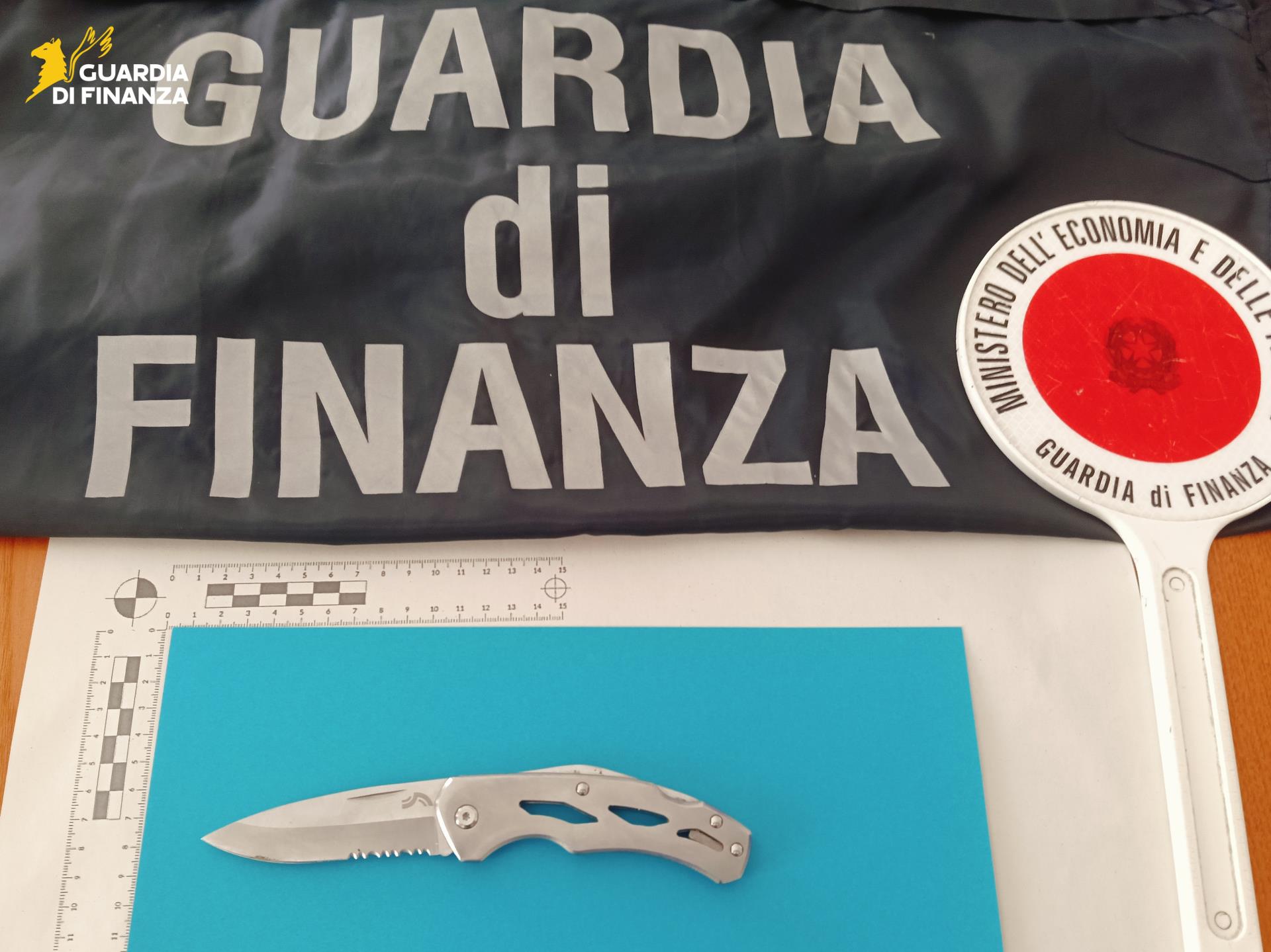 Recuperata la sostanza ed accertatane la natura illecita attraverso l’esame speditivo a mezzo dei reagenti a disposizione degli operanti, i finanzieri del Nucleo Mobile del Gruppo, ritenuto plausibile che il ragazzo potesse occultare ulteriore stupefacente sulla propria persona, hanno proceduto alla perquisizione del soggetto in esito alla quale hanno rinvenuto, all’interno di una tasca della felpa che il giovane indossava, un coltello in acciaio con una lama ripiegabile lunga 9 cm, dotato di meccanismo di blocco della stessa.