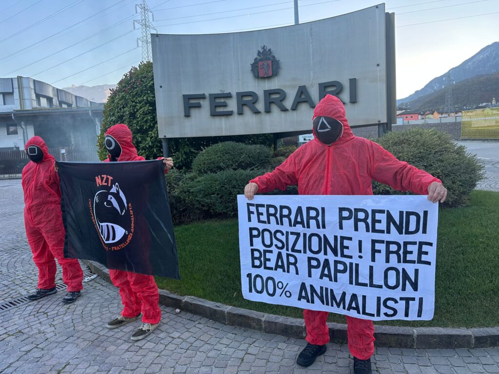 Azione dimostrativa del Movimento Centopercentoanimalisti al Casteller e davanti alla Ferrari per chiedere giustizia per la fauna trentina.