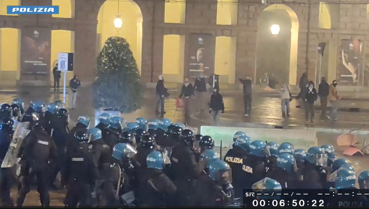 Durante questo tempo si sono registrati ripetuti lanci di bottiglie, pietre e bastoni, agevolati anche dalla costruzione di barricate sia nella piazza che nelle vie limitrofe, dall’accensione di fuochi e dalla continua e persistente azione dei facinorosi contro i rinforzi di polizia inviati sul posto, continuamente presi d’assalto, così come i passanti che transitavano per quelle vie; azioni contrastate solo grazie all’utilizzo di numerosi lacrimogeni, del mezzo idrante e alle cariche di alleggerimento eseguite dai reparti inquadrati.