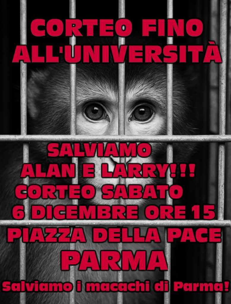 Continuano le manifestazioni per la liberazione dei macachi di Parma Alan e Larry. Il corteo, con ritrovo alle ore 15 in piazza della Pace, raggiungerà gli stabulari dell’ateneo.