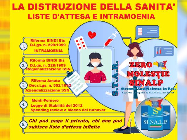 Palermo – L’Organizzazione Sindacale SINALP Sicilia, unitamente alla Rete Zeromolestie SINALP e alle associazioni impegnate nella tutela dei diritti dei cittadini, esprime la più ferma e netta denuncia rispetto al progressivo smantellamento del Servizio Sanitario Nazionale, oggi ulteriormente aggravato da un uso distorto e degenerato del sistema dell’intramoenia introdotta dalla riforma Bindi-bis con D.Lgs. n. 229/1999, come se già non bastava la prima riforma, sempre della Bindi, che aveva già dato una spallata mortale al SSN con la regionalizzazione della sanità.