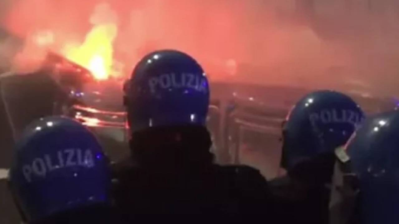 I manifestanti hanno lanciato bombe carta e razzi; la polizia, schierata in un fitto cordone, ha risposto con i lacrimogeni.