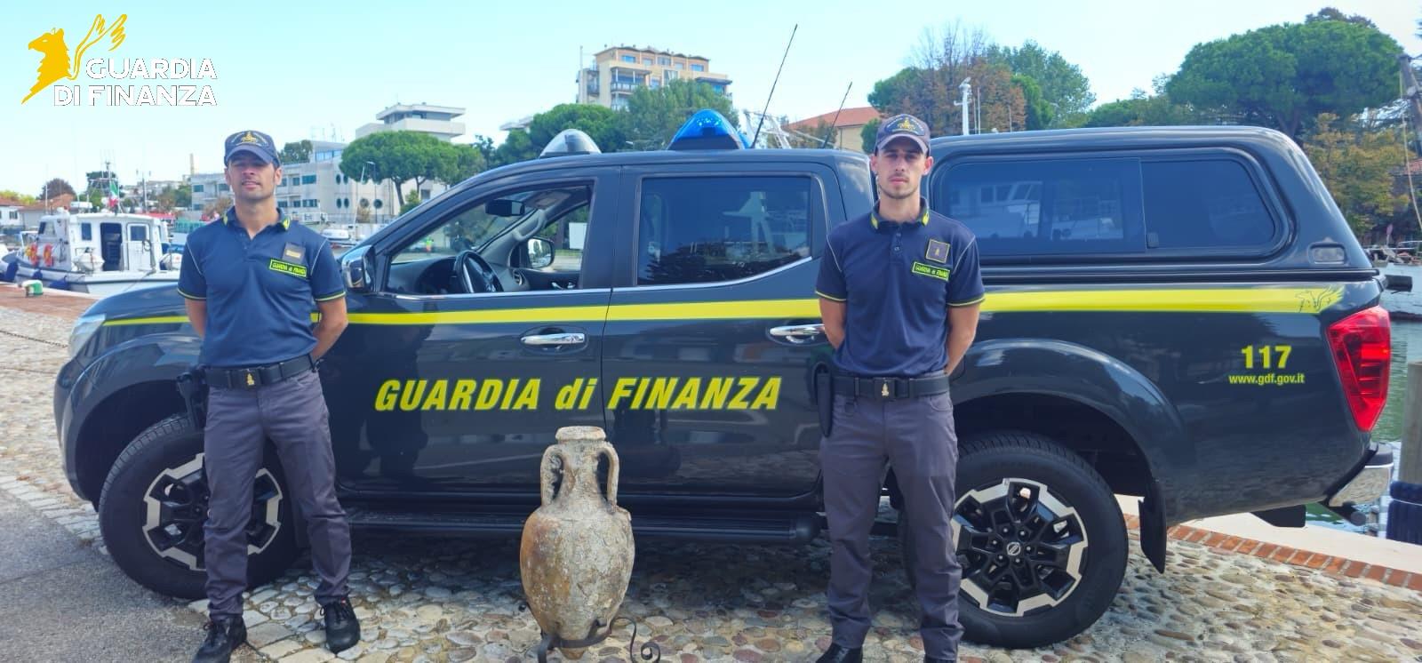 Rimini – È un’antica anfora di epoca romana, quasi completamente integra, il reperto archeologico che i finanzieri della Stazione Navale della Guardia di Finanza hanno sequestrato all’amministratore di un negozio immobiliare del riminese.