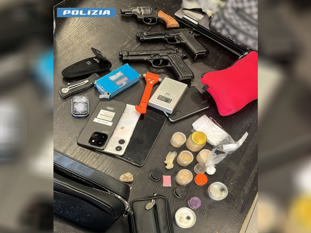 Due arresti, sequestrate droghe di vario tipo, denaro, armi, pistole scacciacani e materiale per lo spaccio.