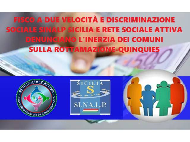 Rottamazione quinquies bloccata in molti enti locali: sigle sindacali denunciano disuguaglianze e chiedono intervento delle istituzioni Palermo – Il SINALP Sicilia, sindacato autonomo dei lavoratori, e l’Associazione Consumatori “Rete Sociale Attiva Sicilia”, lanciano un grido d’allarme che è, al contempo, una denuncia politica e sociale senza appello. La mancata o gravemente ritardata adesione del Comune … Leggi tutto