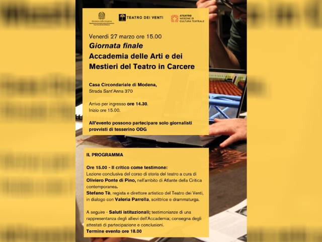 Modena – Si conclude venerdì 27 marzo la prima edizione dell’Accademia delle Arti e dei Mestieri del Teatro in Carcere, un percorso formativo ideato dal Teatro dei Venti all’interno della casa circondariale di Modena, con il sostegno del Ministero della Giustizia.