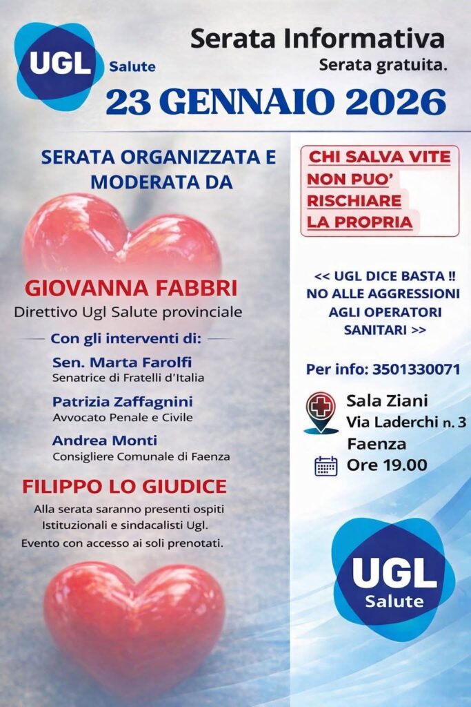 Ravenna – UGL Salute promuove la serata informativa gratuita “Chi salva vite non può rischiare la propria”, un appuntamento dedicato al tema delle aggressioni al personale sanitario, fenomeno in forte aumento e motivo di crescente preoccupazione. L’incontro si terrà venerdì 23 gennaio 2026 alle ore 19 presso la Sala Ziani in via Laderchi 3 a Faenza, ed è rivolto a operatori sanitari, cittadini e rappresentanti istituzionali.