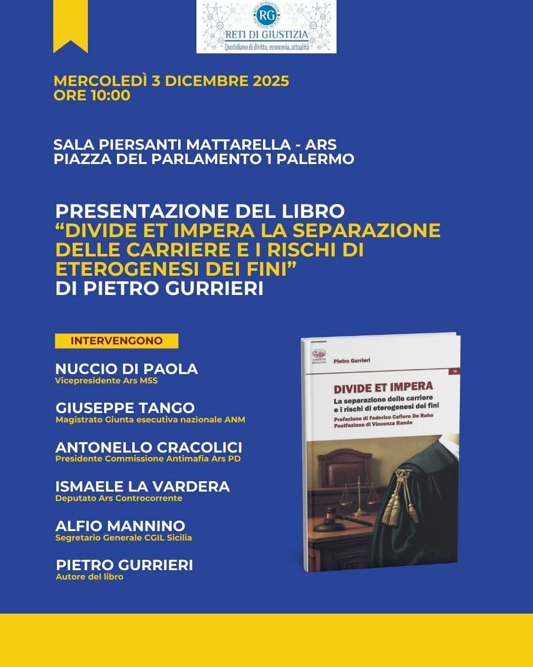 Palermo – Mercoledì 3 dicembre 2025, alle ore 10, presso la Sala Piersanti Mattarella dell’Assemblea Regionale Siciliana (Piazza del Parlamento 1), si terrà la presentazione ufficiale del volume “Divide et Impera. La separazione delle carriere e i rischi di eterogenesi dei fini” di Pietro Gurrieri, edito da Bonanno.